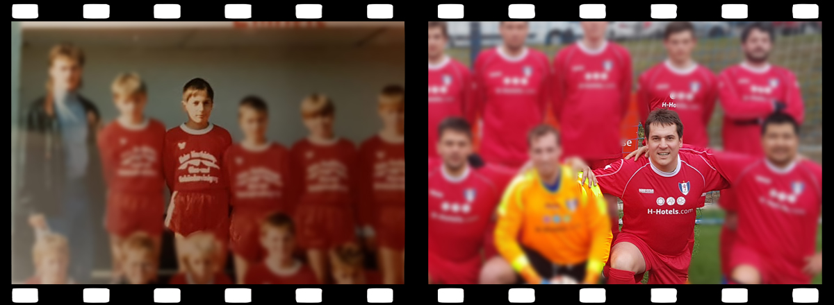 Fußball macht Spaß - damals wie heute! Bereits im Kreise der F-Junioren von Turbine strahlt Martin Meyer in die Kamera. Kein Wunder, schließlich winkt ihm eine zukunftsträchtige Turbine-Karriere, die bis in die Höhen der 2.Mannschaft führte. Und auch in der Gegenwart (links im Bild) scheint der Fußball nichts von seinem Reiz verloren zu haben.