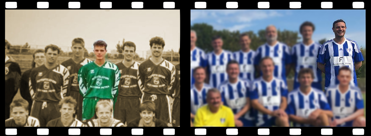 Als erstes Beispiel haben wir für euch im Archiv gekramt. Ihr seht Rico Q. und Daniel W. im Kreise unserer Altherrenmannschaft. Zum Vergleich ein Foto aus gemeinsamen A-Juniorenzeiten aus dem Jahr 1992. Kinder, wie die Zeit vergeht ...