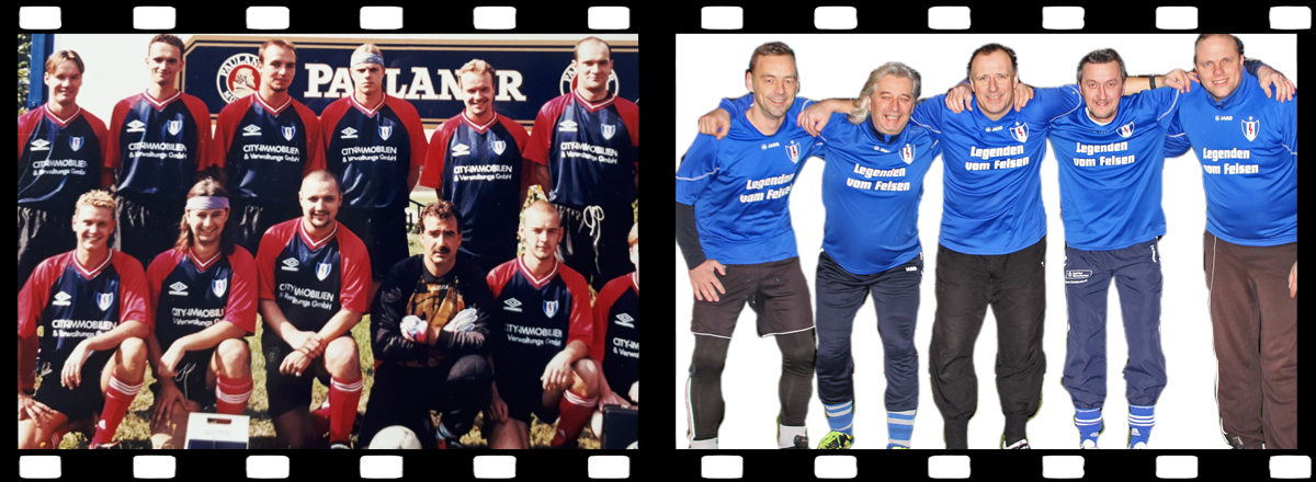 Um eine Felsenlegende zu werden, muss man früh anfangen und dabei bleiben. Klausen präsentiert sich mit der 2.Mannschaft hockend unten rechts mit kurzem Haupthaar zum Beginn der Saison 1999/2000. 20 Jahre später ist die Punktspielkarriere nahezu Geschichte, aber das Legendenshirt hat er sich redlich verdient. Und wer genau hinschaut, erkennt auf beiden Bildern zwei weitere Protagonisten vom Felsen. Kleiner Tipp: Wer kein Stirnband trägt, ist nicht gemeint...