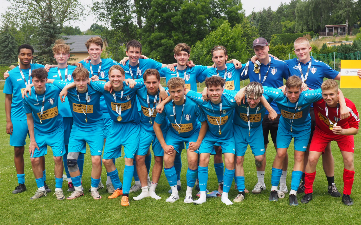 Die konnte auch unsere D1-Jugend in Uichteritz entgegennehmen. Durch ein hochverdientes 1:0 beim Verfolger SSC Weißenfels verteidigen unsere Spieler und Spielerinnen Platz 1 in der Landesliga und konnten nach Abpfiff durch den Jugendausschussvorsitzenden des FSA die Goldmedaillen entgegennehmen. Dan H. schoss bereits nach 10 Minuten das entscheidende Tor und brachte seiner Mannschaft somit Sicherheit. Weißenfels gelang es wie bereits im Hinspiel nicht mehr, die Turbine-Abwehr zu knacken.