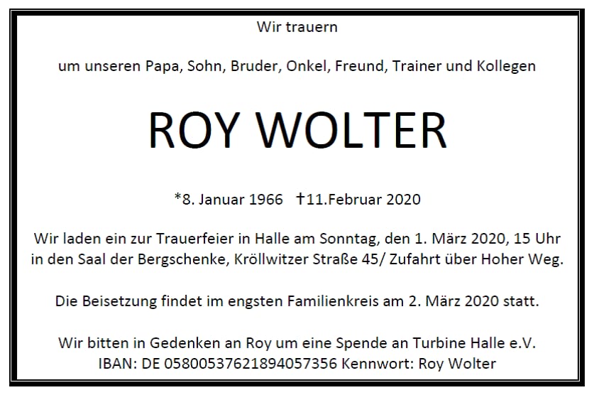 Unser Mitgefühl gilt seiner Familie und seinen Kindern. Am kommenden Sonntag lädt die Familie um 15 Uhr in den Saal der Bergschenke in Kröllwitz zu einer Trauerfeier ein. Statt Blumen wird in Gedenken an Roy um eine Spende an Turbine Halle gebeten.
