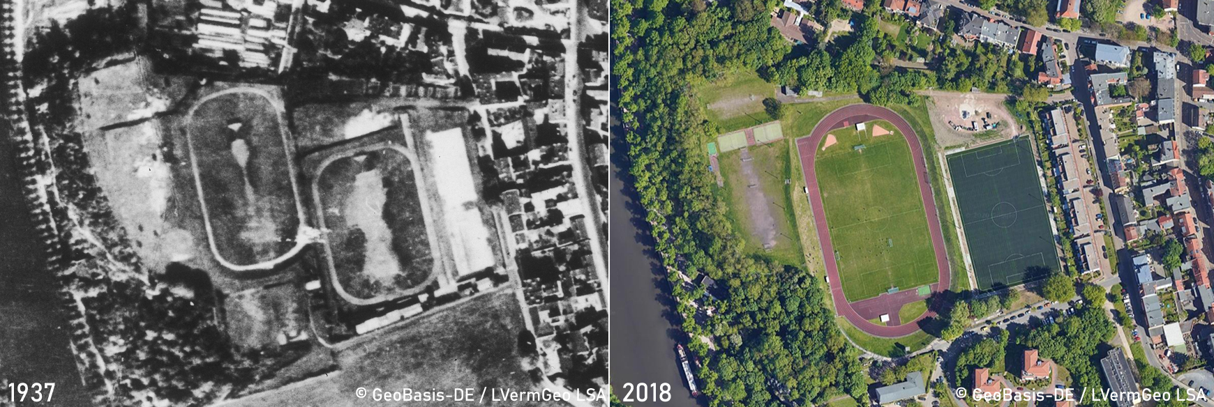 Die Geschichte des Felsens muss noch einmal neu geschrieben werden: Bisher war uns bekannt, dass auf der Fläche des heutigen Kunstrasens die Kicker des Giebichensteiner Sportvereins bereits vor 100 Jahren gegen das Leder traten und der Rasenplatz erst in den 1950er Jahren entstand. Seit wenigen Tagen frei verfügbare historische Luftbilder des Landesamtes für Vermessung und Geoinformation Sachsen-Anhalt zeigen jedoch, dass bereits 1937 der Hauptplatz mit Laufbahn existierte und auf dem Felsen schon vor über 80 Jahren großflächig gekickt wurde. Natürlich befand sich der Platz im Kessel noch einige Meter weiter hinten und entsprach die Laufbahn noch nicht ganz den heutigen Ausmaßen. Aber neben dem östlichen Platz deutlich erkennbar sind bereits eine 100m-Bahn und die Umkleidebaracke am südlichen Rand. Bis in die 1960er Jahre war an das heutige Sportlerheim noch nicht zu denken.