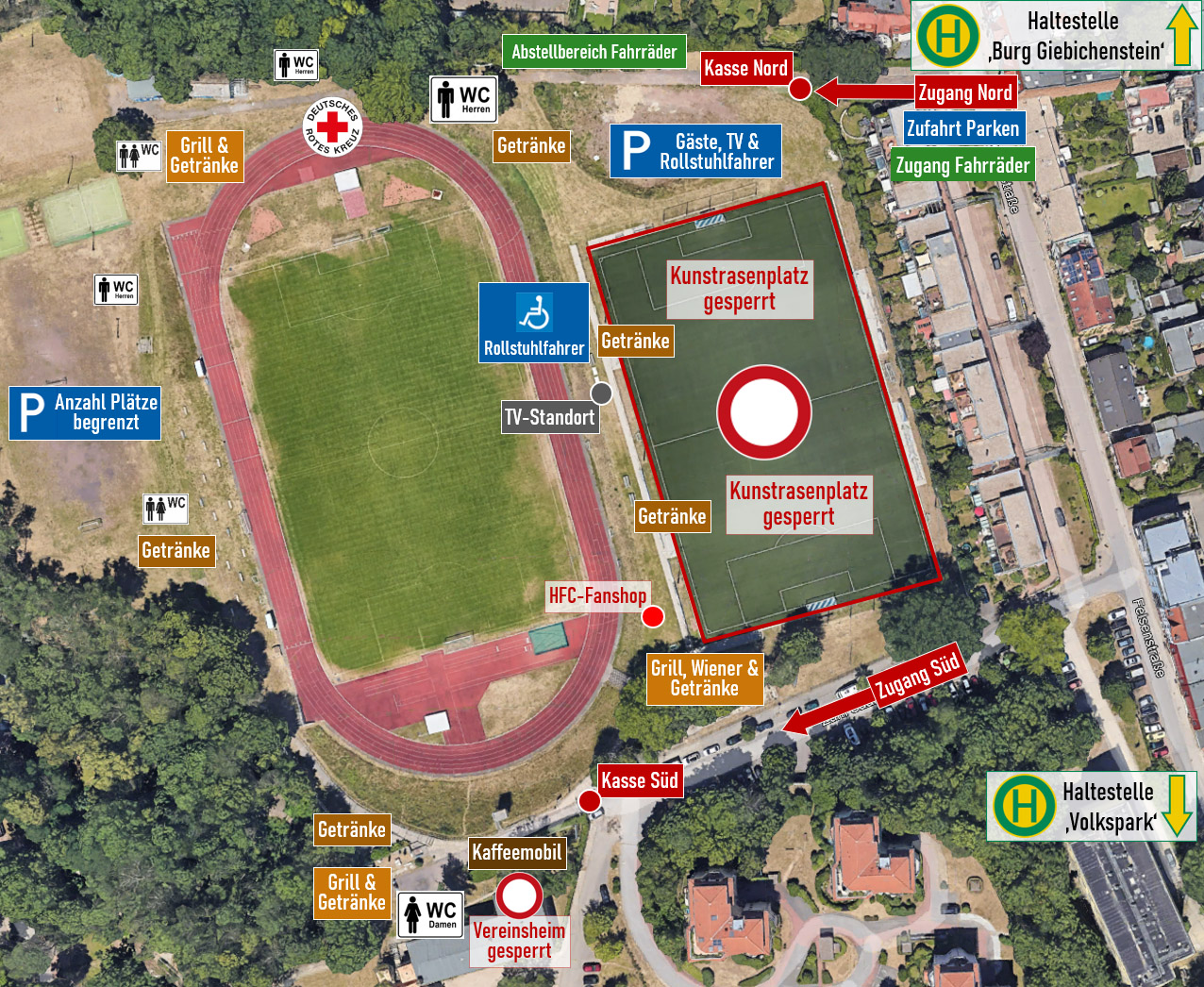 - Für Fans des Halleschen FC mit Fanutensilien ist bevorzugt der Bereich auf der Ostseite zwischen Kunstrasenplatz und Rasenplatz vorgesehen.