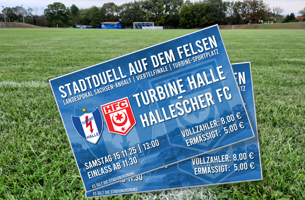 Der nächste Ticketvorverkauf für das am 15. November auf dem Felsen stattfindende Viertelfinalspiel um den Landespokal zwischen Turbine und dem Halleschen FC findet am Dienstagabend von 17 bis 20 Uhr auf dem Turbine-Sportplatz an der Felsenhütte 2.0 statt. Für alle Ortsunkundigen: Die Felsenhütte 2.0 befindet sich an der Südseite des Kunstrasenplatzes.Tickets sind für Vollzahler zum Preis von 8 € erhältlich.