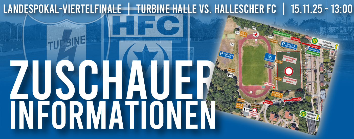 Nur noch wenige Tage bis zum Landespokalspiel auf dem Felsen zwischen Turbine Halle und dem Halleschen FC. Für einen reibungslosen Ablauf der Veranstaltung haben wir organisatorische Hinweise und Informationen für unsere Zuschauer zusammengestellt. Insbesondere bitten wir alle Zuschauer, aufgrund der sehr eingeschränkten Parkmöglichkeiten auf eine Anreise mit dem PKW zu verzichten. Alle weiteren Informationen zu Tickets, Anreise und Versorgung gibt es hier.