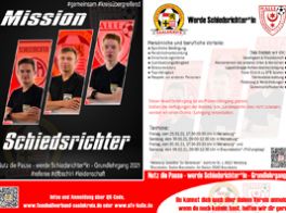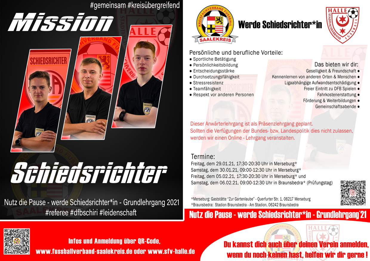 Der Stadtfußballverband bietet gemeinsam mit dem KFV Saalekreis Ende Januar/ Anfang Februar 2021 einen neuen Grundlehrgang für Schiedsrichter an. Auch unser Verein sucht junge und ältere Fußballer und Fußballinteressierte, die Lust und ernsthaftes Interesse haben, sich zum Schiedsrichter ausbilden zu lassen. Die Lehrgänge sind als Präsenzveranstaltung in Merseburg geplant, können aber je nach gültiger Allgemeinverfügung auch als Online-Kurs stattfinden.